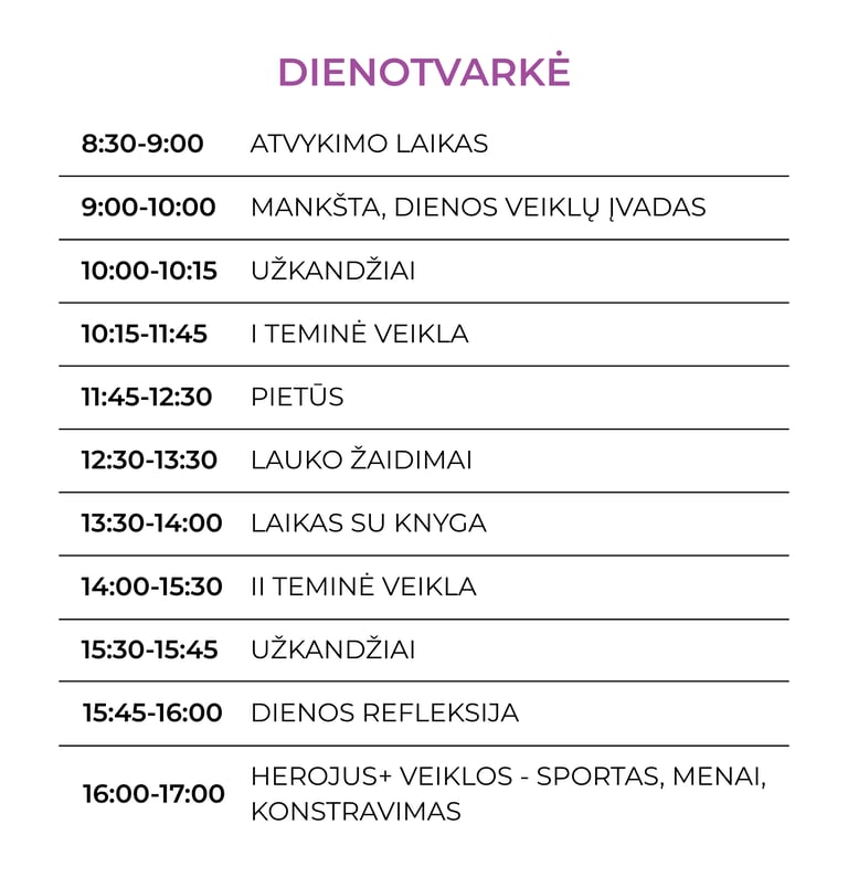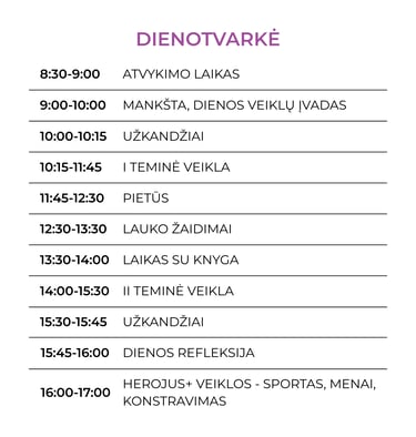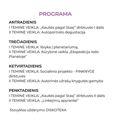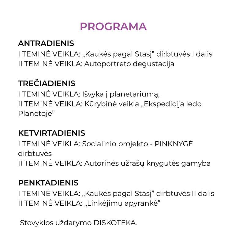 Be kūrybinių veiklų, vaikų laukia ir sporto užsiėmimai, judrūs žaidimai bei išvyka į planetariumą. Savaitę užbaigsime bendra refleksija ir šventine diskoteka.