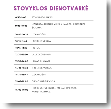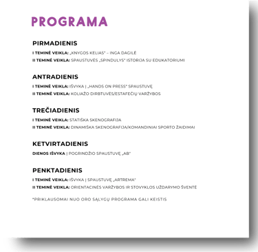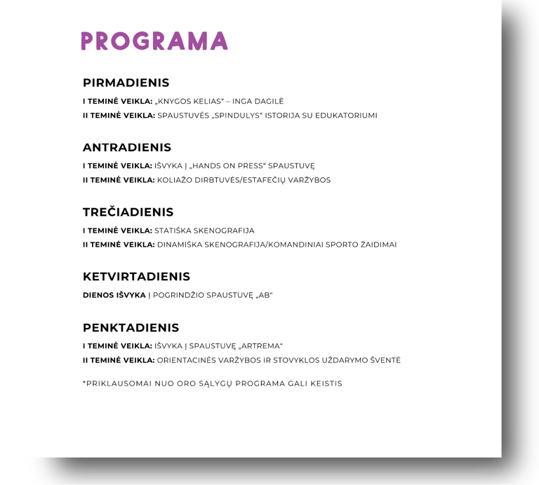 Norime vaikus supažindinti su spaustuvės darbu ir jos užkulisiais – kaip idėja virsta atspausdintu leidiniu. Be kūrybinių veiklų, vaikų laukia ir sporto užsiėmimai, judrūs žaidimai bei orientacinės varžybos!